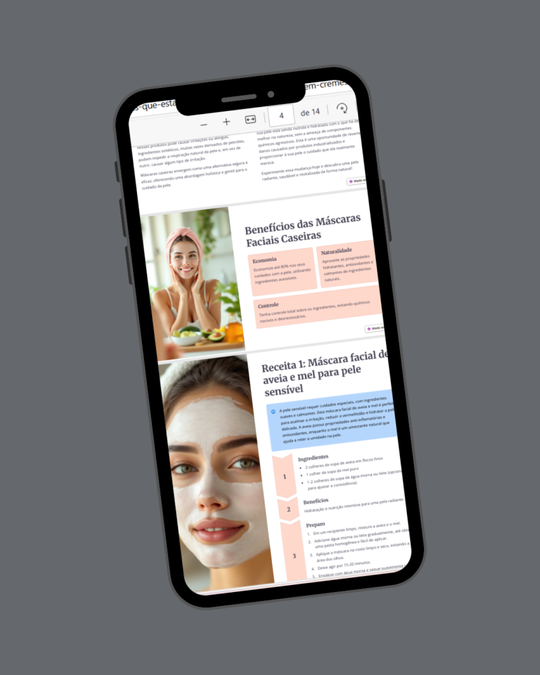Aproveite a promoção exclusiva de lançamento e garanta o Ebook "6 Máscaras Caseiras para Cuidar da Pele" com 50% de desconto.